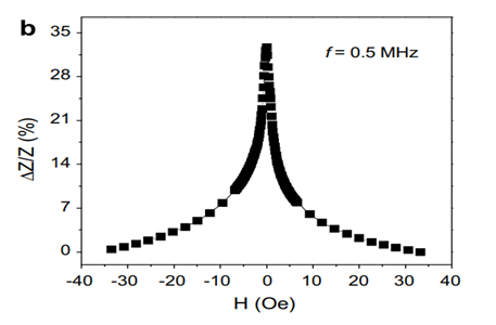 軟磁材料的磁導率 μ(H) 對外加磁場非常敏感,因此當磁場變化時,皮膚深度 δ 會明顯改變,使導線內的電流分布發生變化,進而造成阻抗 Z(H) 的大幅變動。GMI 導線因此能產生巨大的阻抗差異(ΔZ),具有高靈敏度。由於其對弱磁場極為敏感,GMI 導線廣泛應用於高靈敏磁感測器、地磁量測以及旋轉元件監測等領域。一個典型的 GMI 效應範例如圖所示